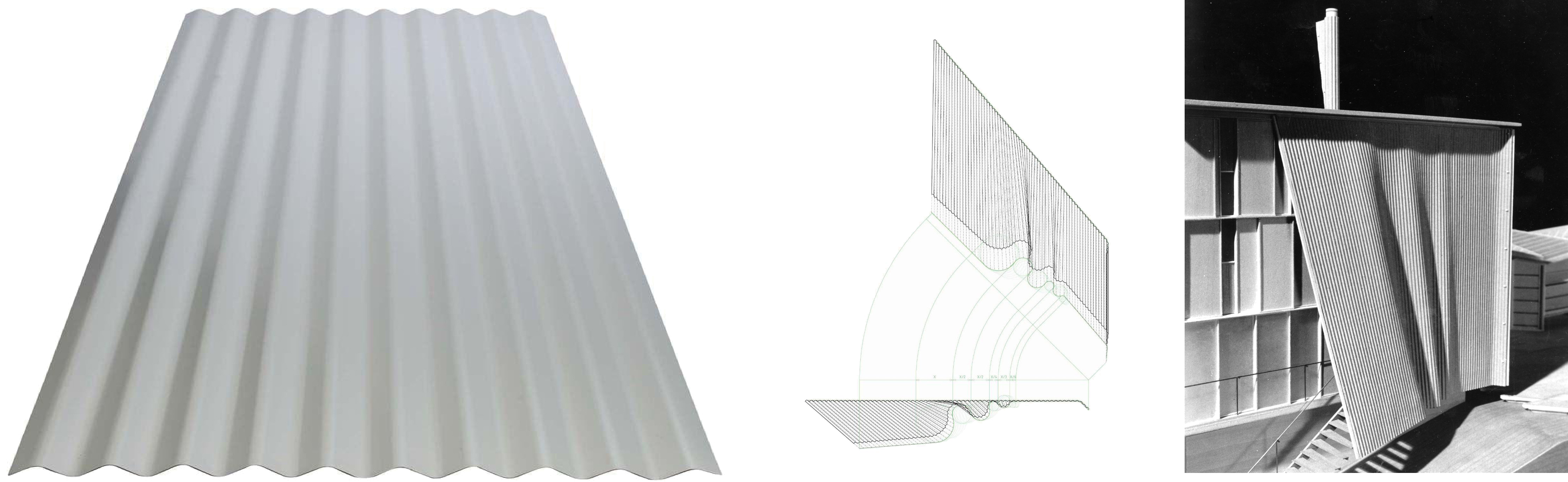 From a conventional standpoint, the role of materiality can be cited as the eventual hurdle a project must overcome as it becomes slated for reality —that is, in the transitional moment from abstract to specification. Of course, this also presumes a methodological bias that establishes a design process that represses specification as a point of departure. Recognizing ‘buildings’ as the basis of speculations, one could also see how their very materiality might pro-actively offer the basis for critique, challenge and speculation. It also offers a way to imagine leap-frogging over the ‘representational’ moment in the design process, or alternatively to redefine the idea of representation. If the traditional notion of representation offers a pictorial —or illustrative—bias, then in architectural projection, there is always a more instrumental role between drawing, geometry, and the idea of building. Here the aggregation of lines can amount to an act of construction: to build a drawing as a proof of a theorem. I am reminded of the Weston House sidewall, where the corrugated metal curtain wall accepts its figural shaping in accordance with the limits of a ruled surface. The relationship between corrugation and drawing is demonstrative here in that the vertical lines that define the ribs of the corrugation also form the vertices that help define a developable surface. That the length of the straight upper line of corrugation is the same length as the undulating line at the bottom is a demonstration that drawing is already an act of construction. In turn, the grain that is produced by corrugation is also a manifestation of the agency of materiality, in particular the way in which a skin is able to produce spatiality. Thus, the “sine wave” of corrugation is also indelibly connected to the larger instrumentality of architectural potentials it imparts.